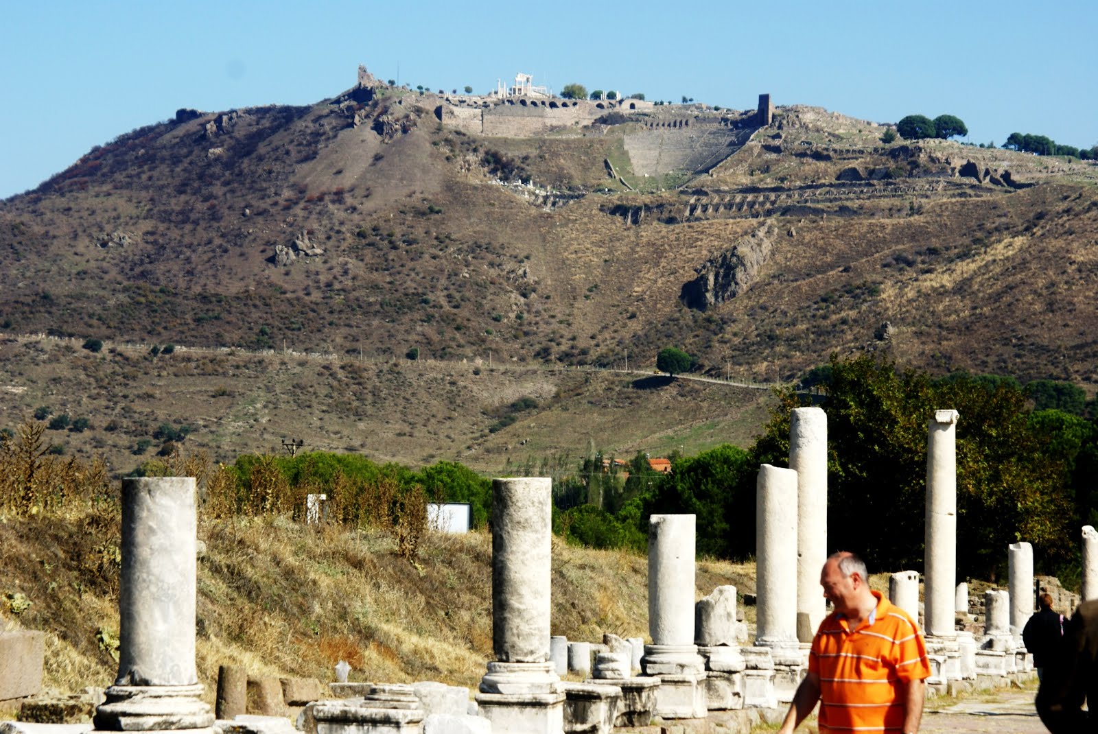 Com as colunas do Templo de Trajano com algumas arquitraves.Parte da acrópole de Pérgamo foram transferidas para o Museu de Pérgamo de Berlim, para onde foram levados após suas descobertas em escavações de 1871 feitas pelo engenheiro alemão Carl Humann.Os que forem a Berlim não devem perder a oportunidade em visitar este museu.